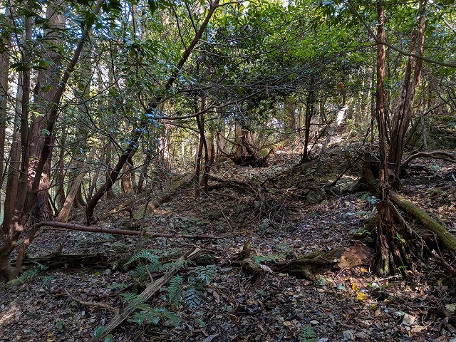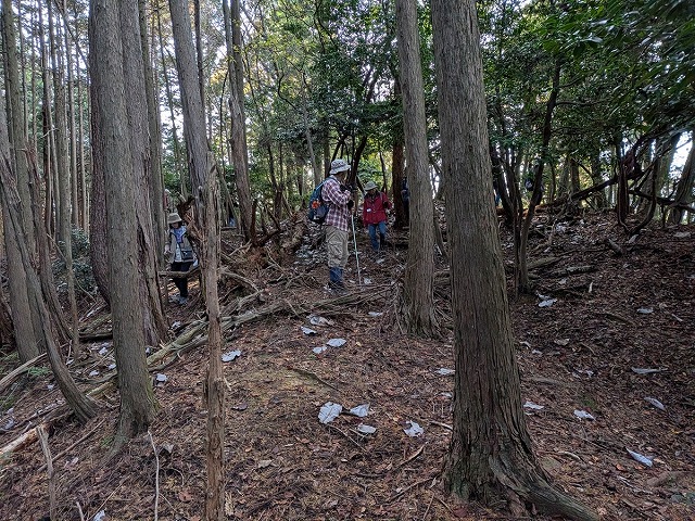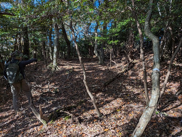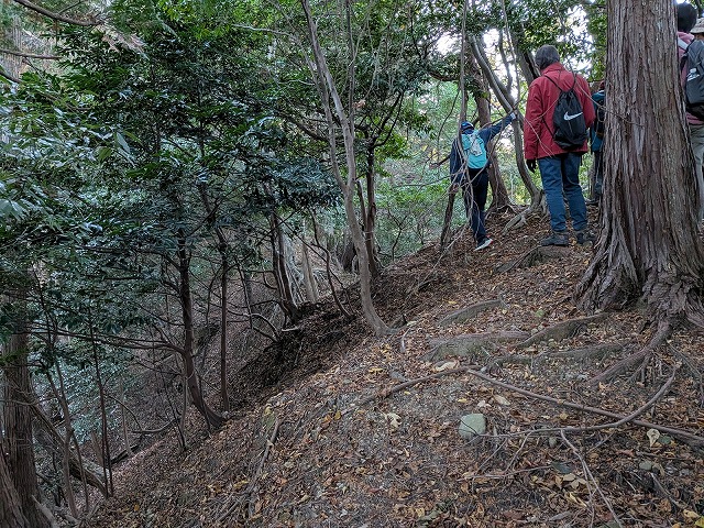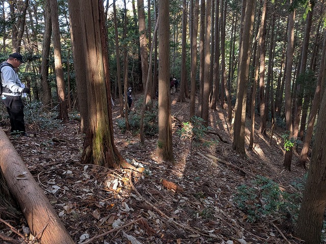 南宮山の見所のひとつは、9月に下見した担当者(繁田、大木)が、CS立体図で陣所跡がありそうだと狙いをつけていた、毛利秀元陣跡から200m北にある小ピークでした。確認した結果、知られていない遺構跡であると判断し、見学会資料にも縄張図も添付しておりましたので、参加者全員でじっくりと確認しました。これが遺構だということは、南宮山の山稜に点在する南宮十坊の跡地等はいずれも毛利軍が駐屯したと言えるだろうということが想像できました。