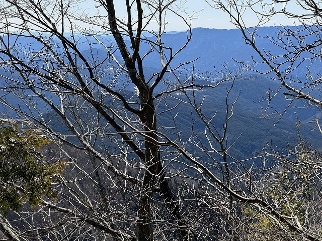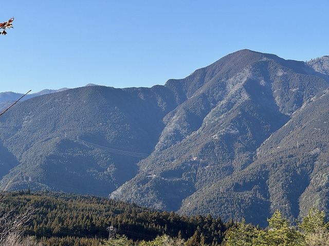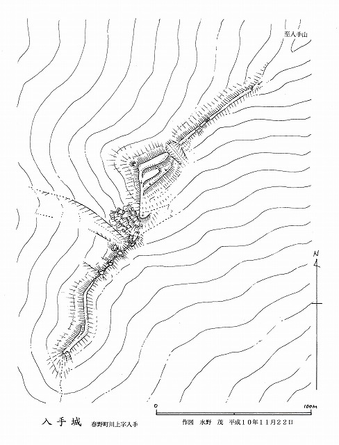 大井川右岸の山上から望む入手城(中段出っ張り部)